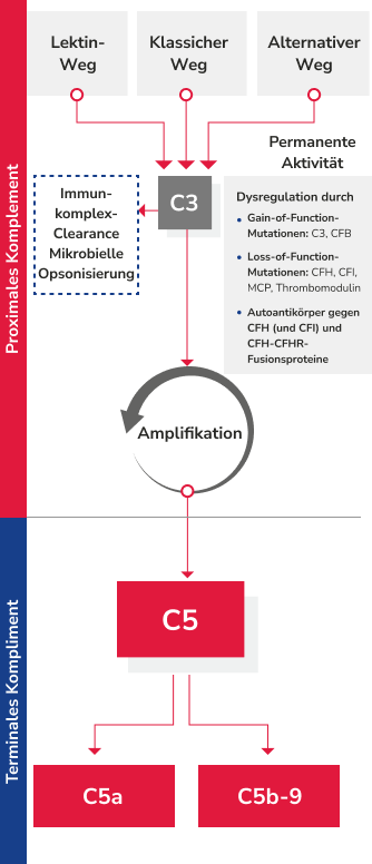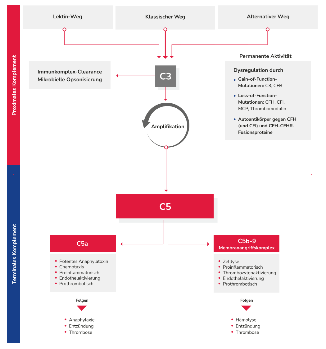 Das atypische Hämolytisch-Urämische Syndrom (aHUS) ist eine seltene Form der thrombotischen Mikroangiopathie (TMA), die typischerweise durch eine Dysregulation des Komplementsystems verursacht wird und daher häufig als komplementvermittelte TMA klassifiziert wird. Diese Dysregulation führt zu einer unkontrollierten Komplementaktivierung, die der Körper nicht mehr effektiv regulieren kann. Die Folge ist eine Schädigung des Endothels durch terminale Komplementbestandteile (Membranangriffskomplex), welche die Grundlage für die Entwicklung einer TMA bildet.ref_Smith_Jackson_2025aHUS als Folge eines dysregulierten Komplementsystemsref_Loriat_C_2011ref_Noris_M_2009ref_Holers_MV_2008ref_Hirt-Minkowski_2010ref_Noris_M_2010ref_de_Cordoba_SR_2014ref_Lemaire_M_2013ref_BU_F_2017