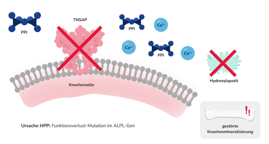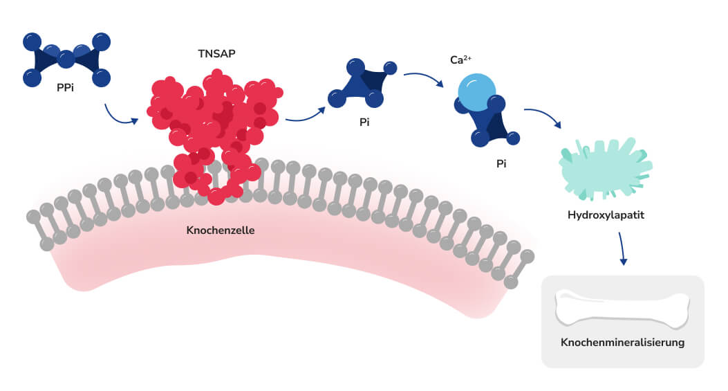 Pathogene Mutationen im Gen für die TNSAP (ALPL) reduzieren die AP-Aktivität, was eine gestörte Knochen- und Zahnmineralisierung sowie neurologische, muskuloskelettale, gastrointestinale und renale Symptome zur Folge haben kann.ref_Whyte_MP_2016ref_Orimo_H_2010