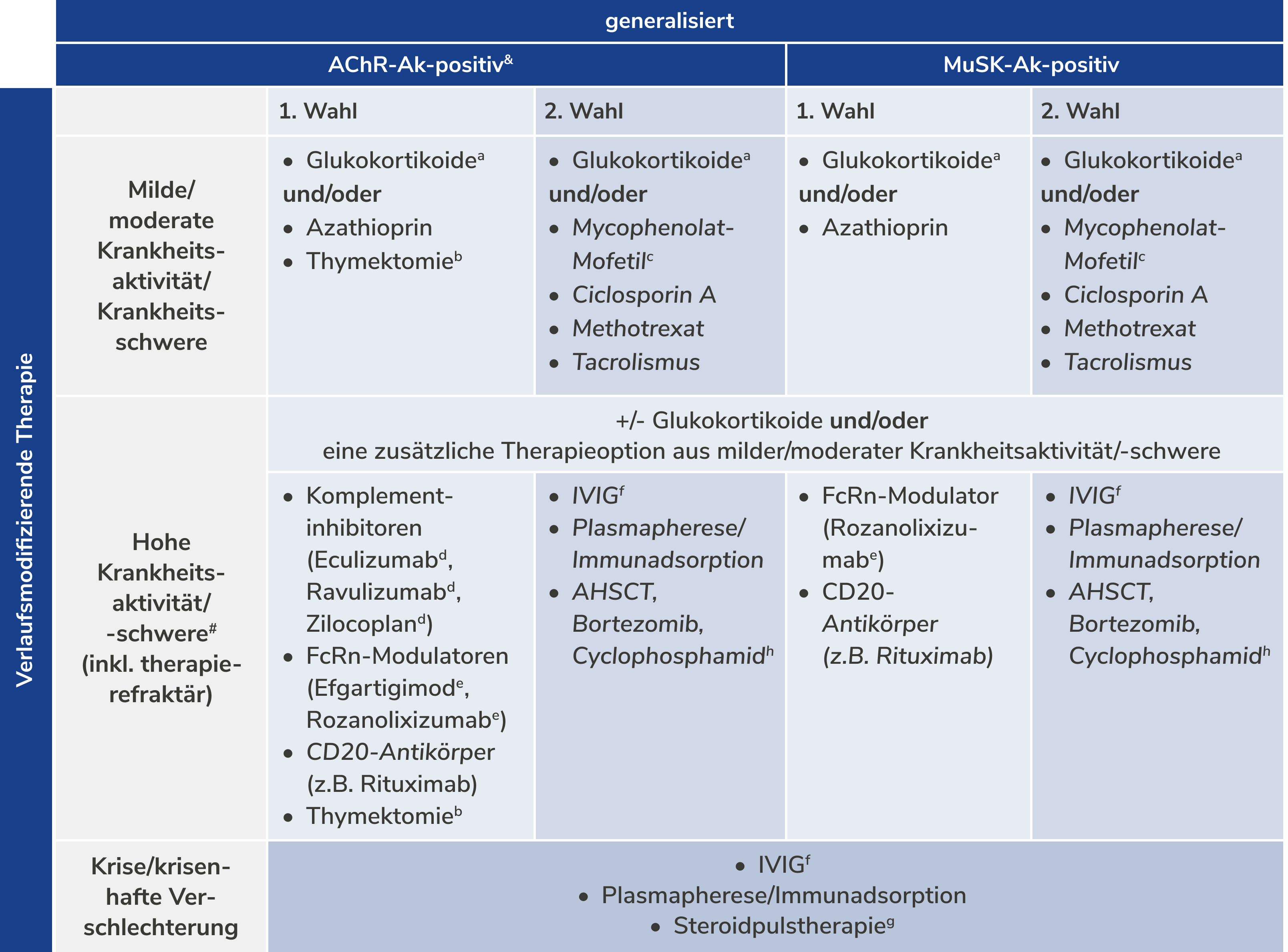 e) Efgartigimod ist als Add-on-Therapie für die AChR-Ak-positive gMG zugelassen. Rozanolixizumab ist als Add-on zur Standardtherapie für die AChR-Ak- und die MuSK-Ak-positive gMG zugelassen.