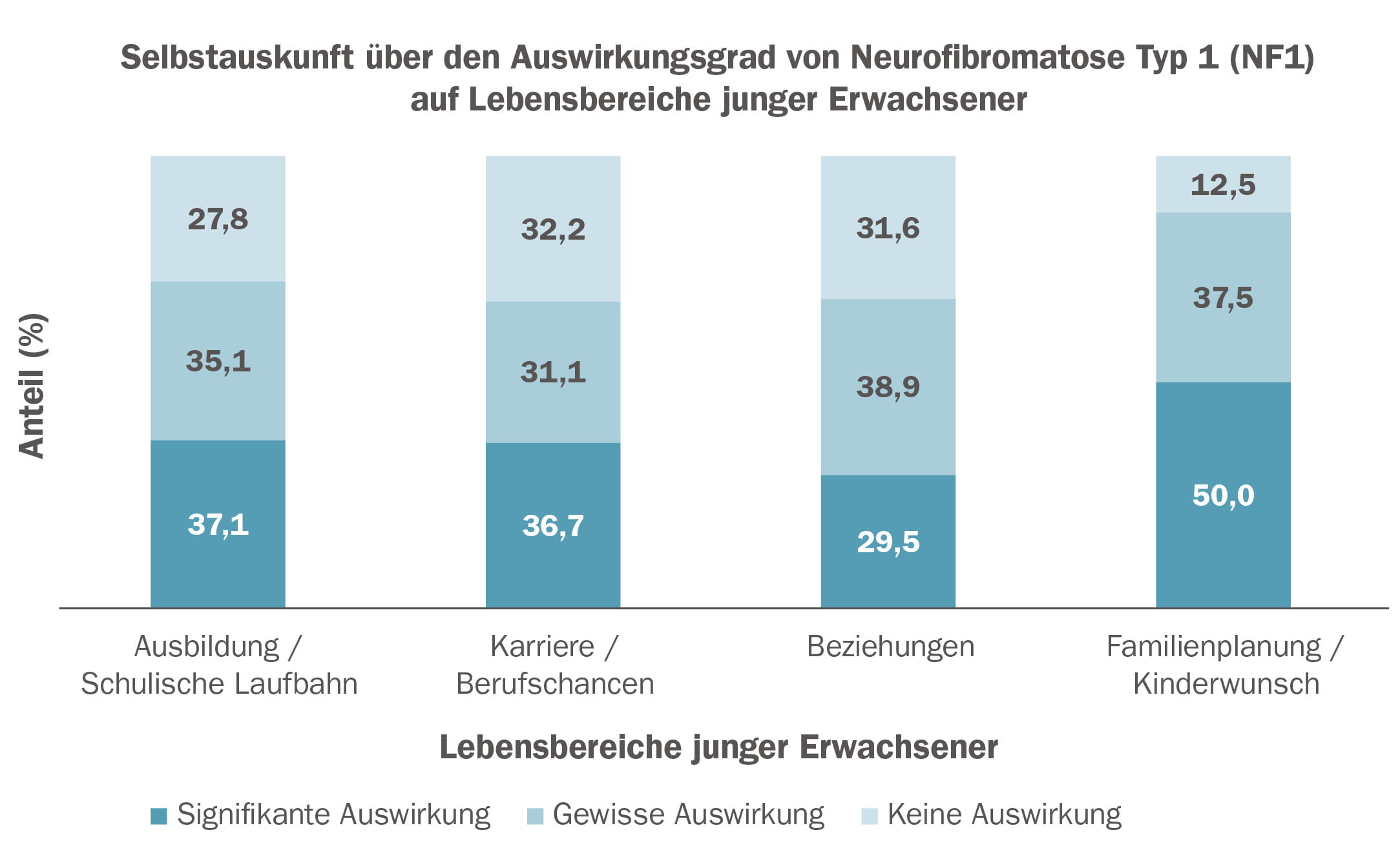 Auch im Jugendalter hat NF1 einen starken Einfluss auf das Leben. Einer Studie zufolge empfinden junge Betroffene, dass die Erkrankung einen gewissen oder gar erheblichen Einfluss auf ihre Ausbildung, Karriere, Beziehungen und insbesondere Familienplanung hat (Abb. 1).ref_Weisman_2023
