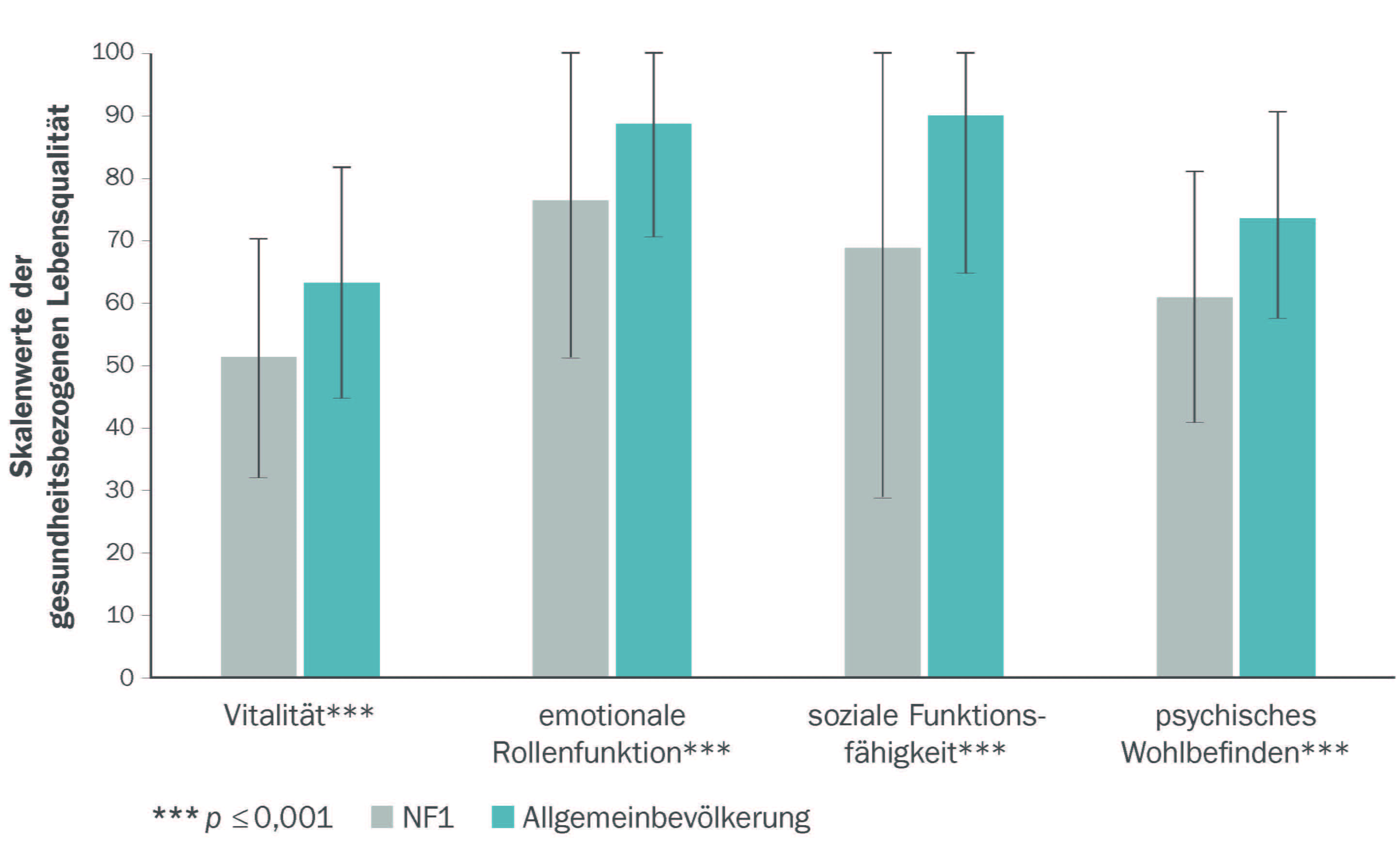 Personen mit NF1 haben eine geringere Lebensqualität als die Allgemeinbevölkerung.ref_Weisman_2023ref_Wolkenstein_2001 Sowohl bei Kindern als auch bei Erwachsenen mit NF1 ist die Lebensqualität beeinträchtigt und die dazugehörigen Bewältigungsstrategien sind nicht bekannt.ref_Weisman_2023 Erwachsene mit NF1 haben eine signifikant niedrigere Lebensqualität hinsichtlich Vitalität, soziale Funktionsfähigkeit, emotionale Rollenfunktion und psychisches Wohlbefinden (Abb. 2).**˒ ref_Reichardt_2013