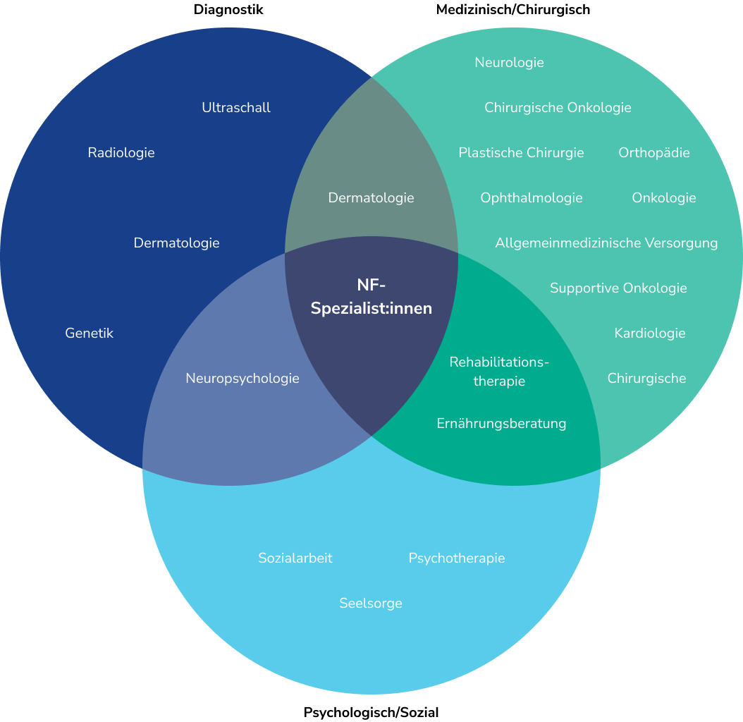 Das folgende Venn-Diagramm veranschaulicht die multidisziplinäre Versorgungsstruktur bei NF1. NF-Spezialist:innen können dabei Funktionen in mehreren beteiligten Fachdisziplinen übernehmen, etwa in der Genetik, Dermatologie, Allgemeinmedizin oder Neurologie.