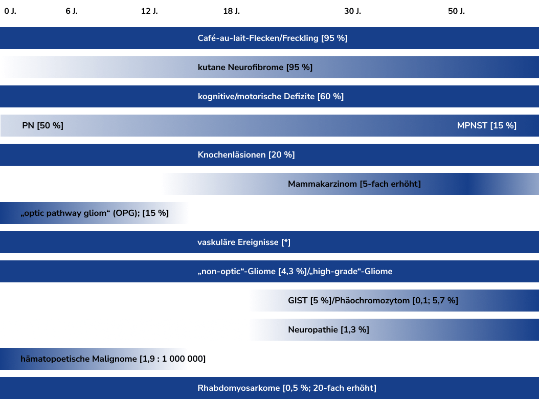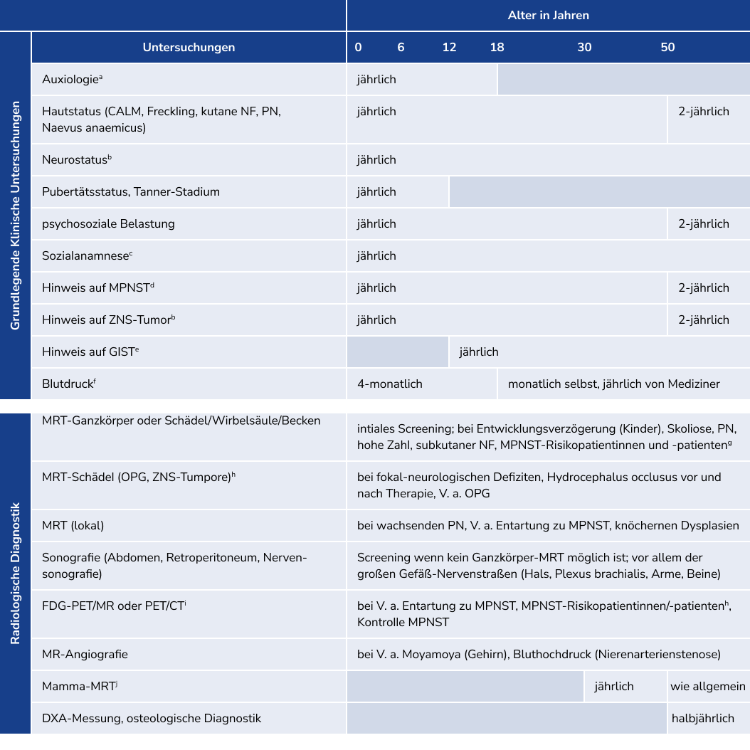 Neurofibromatose Typ 1 (NF1) ist mit kutanen, neurologischen, orthopädischen und neoplastischen Manifestationen verbunden, die teilweise progredient verlaufen und zu erheblicher Morbidität führen können.ref_Bergqvist_2020 Da NF1 derzeit nicht heilbar ist, kommt der Früherkennung möglicher medizinischer, neuropsychologischer und psychosozialer Probleme eine besondere Bedeutung zu. Ziel der multidisziplinären Betreuung ist es, durch frühzeitige Intervention die Krankheitslast zu reduzieren.ref_Hendrich_2023