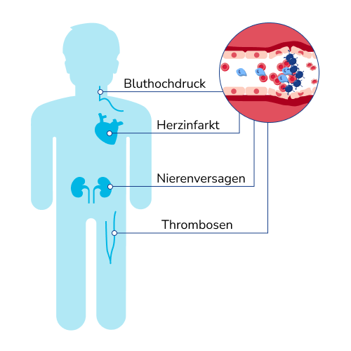 Da das unkontrollierte Komplementsystem bei aHUS im gesamten Körper aktiv ist, entstehen bei Betroffenen Blutgerinnsel im ganzen Körper. Deshalb spricht man bei aHUS auch von einer systemischen, also einer den ganzen Körper betreffenden, Erkrankung. Die Blutgerinnsel verstopfen vor allem die kleinen Gefäße, die sogenannten Kapillaren. Die am häufigsten betroffenen Organe sind dabei die Nieren. Es können aber auch andere Organe wie das Herz oder die Lunge betroffen sein. Durch die Verstopfung der Kapillaren werden die betroffenen Organe nicht mehr ausreichend mit Blut versorgt, was deren Funktion beeinträchtigen und zu dauerhaften Schäden führen kann.
