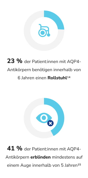 In den selteneren Fällen, in denen keine AQP4-Antikörper nachgewiesen werden können, ist die Diagnose etwas schwieriger. Dann werden bei den Untersuchungen noch weitere Kriterien hinzugezogen, um die NMOSD auch sicher von anderen Erkrankungen wie z.B. Multiple Sklerose abgrenzen zu können. Eine korrekte Diagnosestellung ist deshalb auch bei Patient:innen ohne AQP4-Antikörper möglich.13