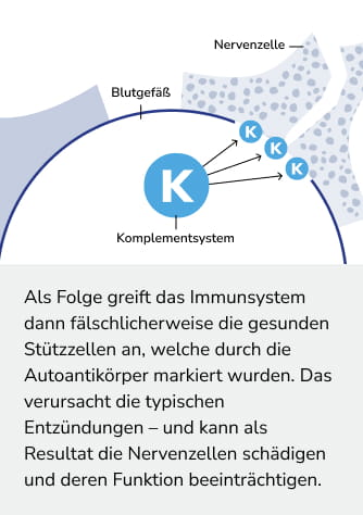 Grund dafür sind bei ca. 75 % der NMOSD-Patient:innen sogenannte Autoantikörper (AK). Diese richten sich nicht wie normale Antikörper gegen Krankheitserreger, sondern gegen ein bestimmtes körpereigenes Eiweiß: dem Wasserkanalprotein Aquaporin-4 (AQP4).9 Dieses Protein reguliert den Wassertransport bestimmter Körperzellen - vornehmlich bei bestimmten Zellen des Nervensystems (sogenannte Stützzellen), welche vor allem im Gehirn und Rückenmark vorkommen.8